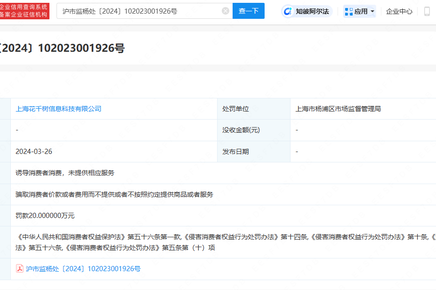 近日,世紀(jì)佳緣關(guān)聯(lián)公司上?;ㄇ湫畔⒖萍加邢薰疽蝌_取消費(fèi)者價款或者費(fèi)用而不提供或者不按照約定提供商品或者服務(wù),被楊浦區(qū)市場監(jiān)督管理局罰款20萬元。精華推薦