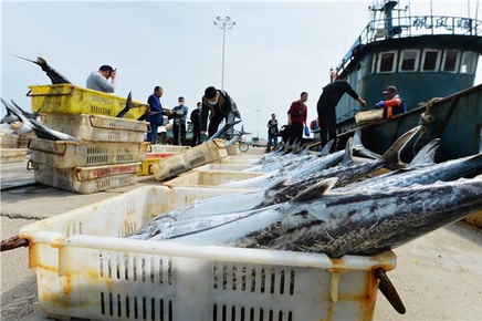 青島市嶗山區(qū)中心漁港一派繁忙景象,漁民將捕獲的2萬(wàn)余斤鲅魚(yú)迅速運(yùn)送上岸、分揀過(guò)磅,投放春季市場(chǎng)。